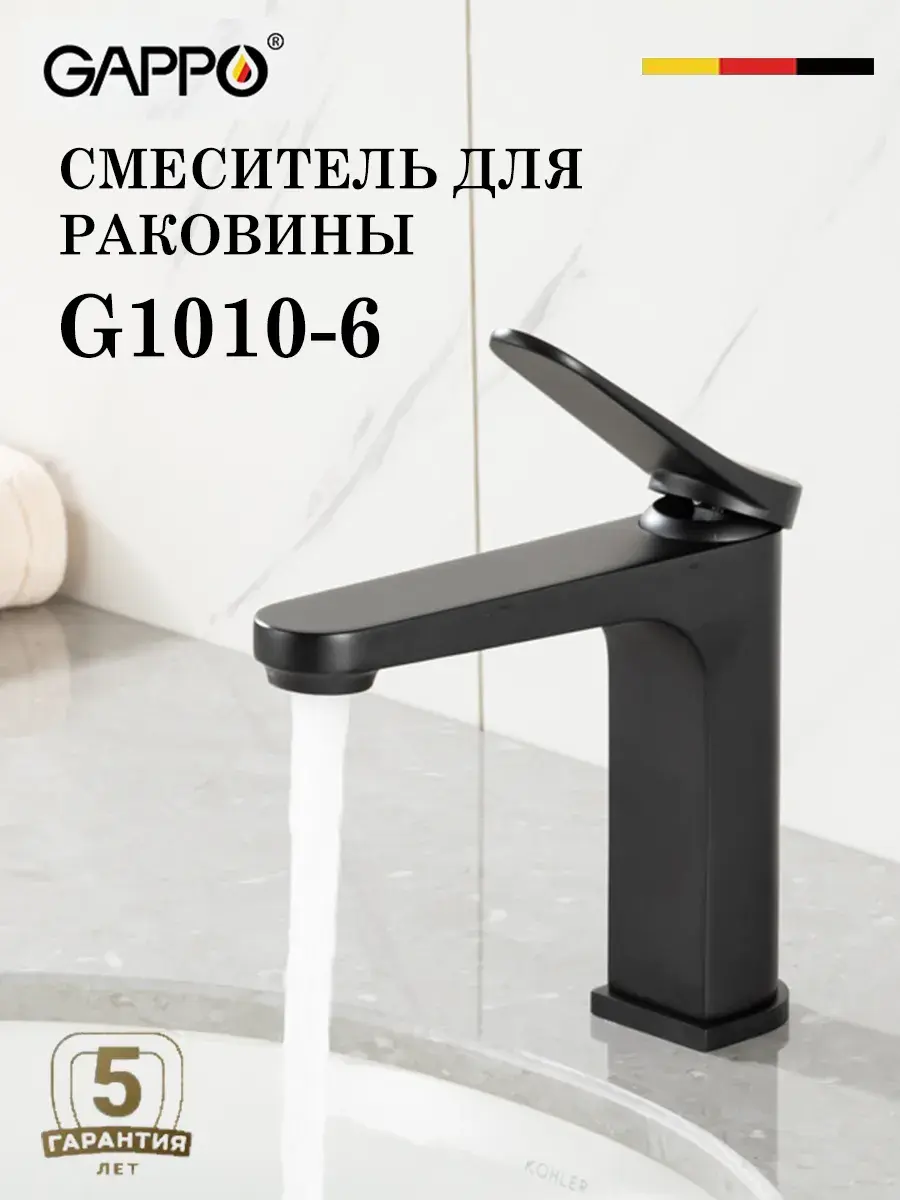 Смеситель для раковины Gappo G1010-6 в черном цвете, позволяет с лёгкостью контролировать напор воды, с помощью однорычажного управления. Аэратор в приборе позволит обеспечить равномерную подачу воды и ее относительноесмягчение. Специальная сетка внутри устройства отфильтровывает различные примеси. Модель устанавливается с помощью гайки, нижняя часть смесителя вставляется в специальное отверстие для монтажа и с обратной стороны затягивается гайкой. Оснащен керамическим картриджем, который смешивает потоки холодной и горячей воды. Помимо этого уменьшается шум от импульсов подачи воды.