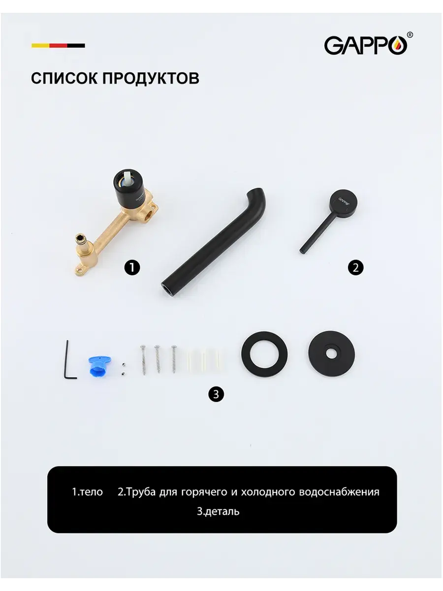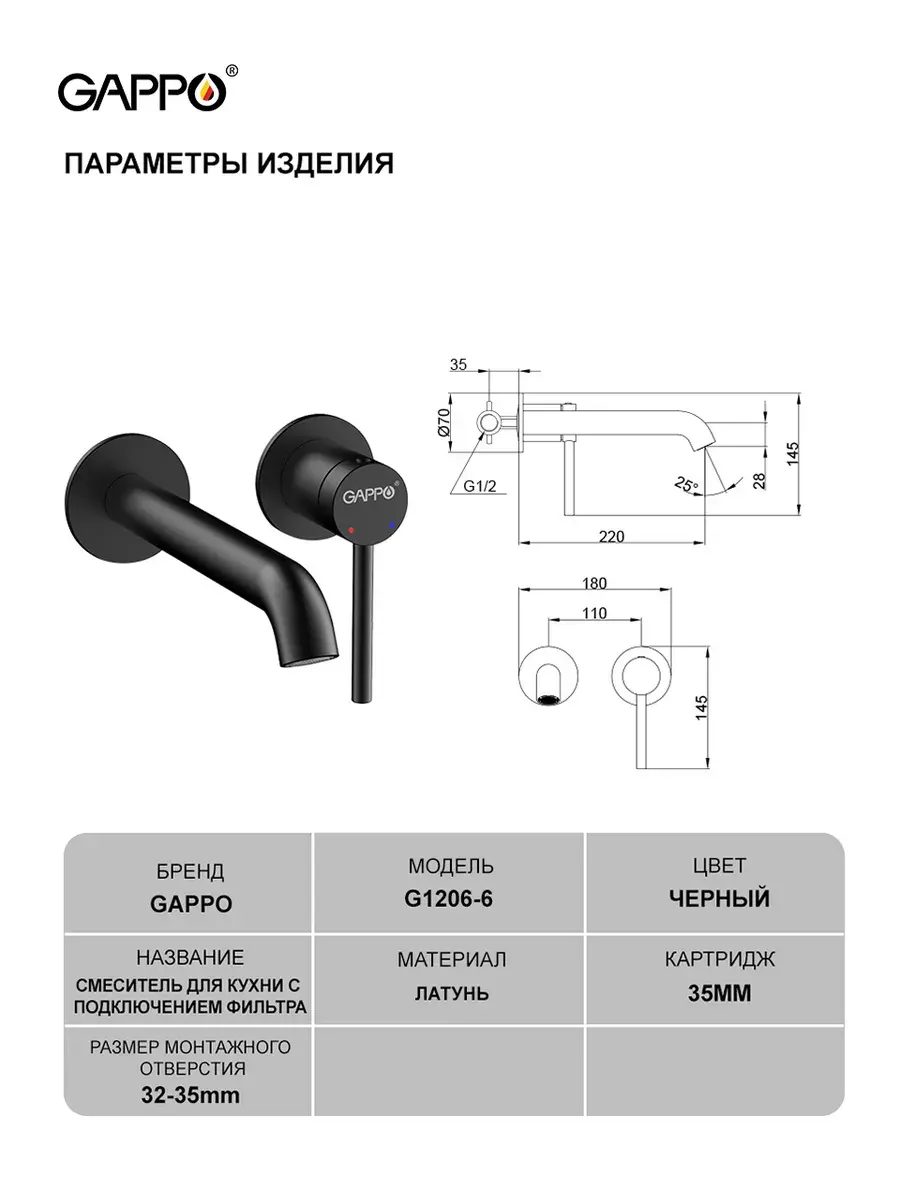 Смеситель для раковины встраиваемый G1206-6 в черном цвете - это качественное и функциональное сантехническое оборудование от известного производителя Gappo. Если у вас есть желание обновить свою ванную или кухню, то данный смеситель станет прекрасным выбором для вас. Он сочетает в себе стильный дизайн и высокие технические характеристики, которые позволят вам комфортно пользоваться умывальником. Его удлиненный, излив обеспечит удобство и комфорт при использовании. Благодаря керамическому картриджу SEDAL, вы сможете регулировать поток воды с легкостью, получая идеальную температуру воды для своих нужд. Смеситель гаппо имеет функцию скрытого монтажа, что делает его эстетичным и современным. Черная отделка придает смесителю стиль и делает его устойчивым к коррозии. Этот смеситель оснащен надежной и долговечной латунной конструкцией, что гарантирует его долгий срок службы. Комплектация смесителя включает все необходимые элементы для установки, что позволяет вам приступить к использованию оборудования сразу же после покупки.