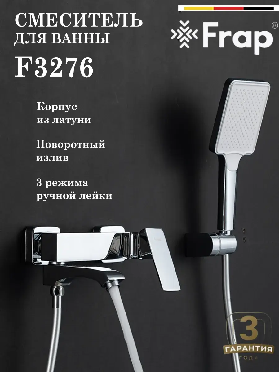 Смеситель для ванны с душем F3276 бренда Frap относится к продукции класса «люкс». Изготовлен из высококачественной латуни, что гарантирует его долговечность и надёжность, а также оснащён аэратором, который обеспечивает равномерный поток. Корпус оснащен испанским картриджем Sedal, который плавно открывает воду. Переключение с излива на ручную лейку производится его поворотом. Душевая лейка имеет 3 режима, которые меняются при помощи нажатия кнопки. Кран для ванны с коротким изливом станет стильной изюминкой Вашей ванной комнаты. Производитель даёт гарантию 3 года на корпус смесителя и 1 год на покрытие «хром».