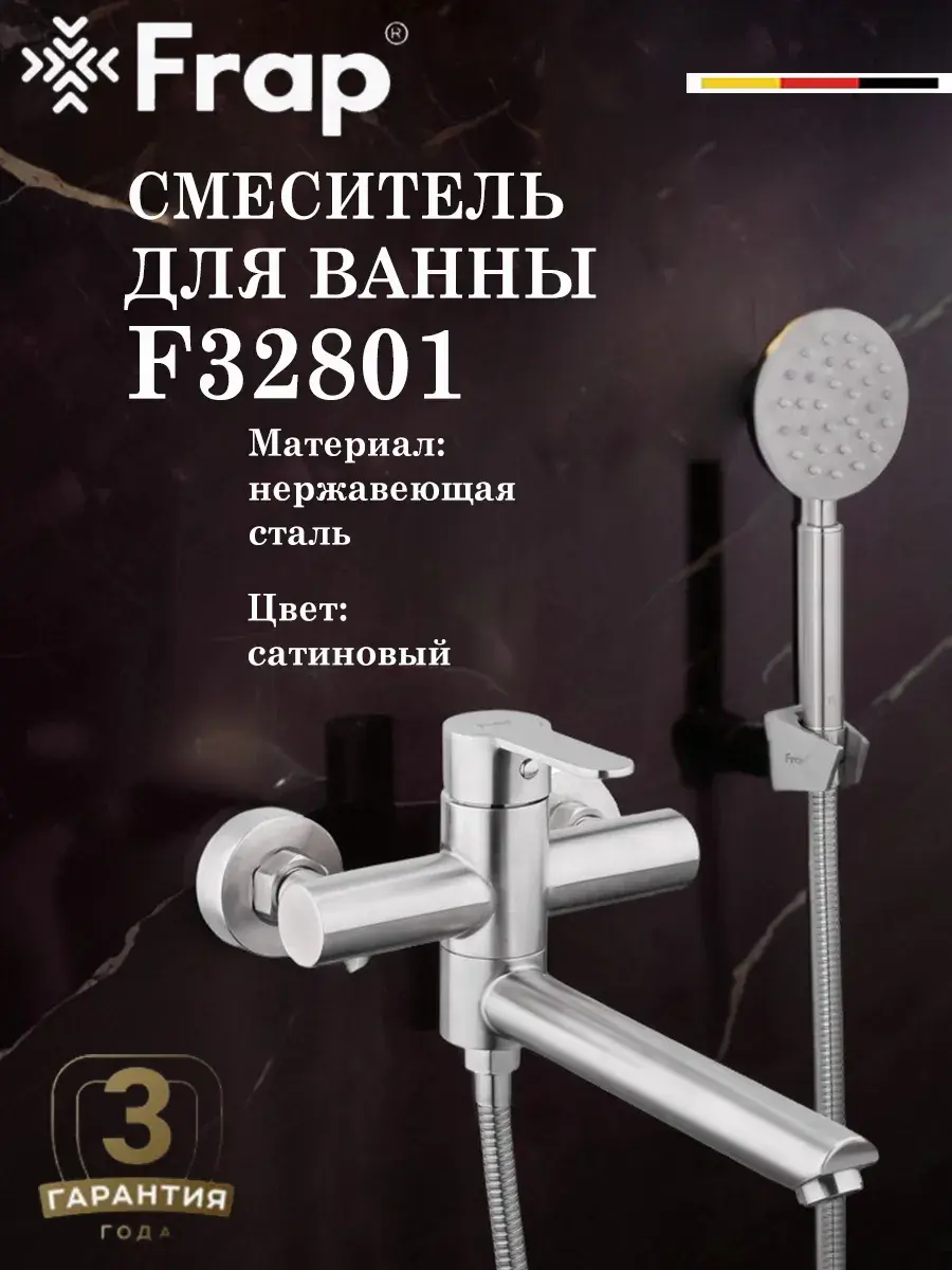 Смеситель для ванны с душем F32801 бренда Frap относится к продукции класса «люкс». Изготовлен из высококачественной нержавеющей стали, что гарантирует его долговечность и надёжность, а также оснащён аэратором, который обеспечивает равномерный поток. Корпус оснащен испанским картриджем Sedal, который плавно открывает воду. Переключение с излива на ручную лейку производится его поворотом. Душевая лейка имеет 3 режима, которые меняются при помощи нажатия кнопки. Кран для ванны с коротким изливом станет стильной изюминкой Вашей ванной комнаты. Производитель даёт гарантию 3 года на корпус смесителя и 1 год на покрытие «сатин».