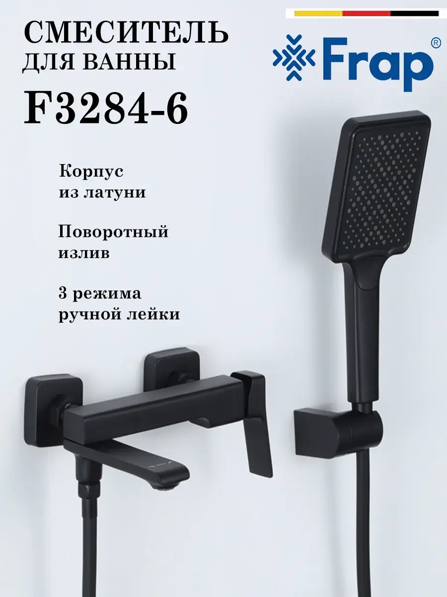 Смеситель для ванны с душем F3284-6 бренда Frap относится к продукции класса «люкс». Изготовлен из высококачественной латуни, что гарантирует его долговечность и надёжность, а также оснащён аэратором, который обеспечивает равномерный поток. Корпус оснащен испанским картриджем Sedal, который плавно открывает воду. Переключение с излива на ручную лейку производится его поворотом. Душевая лейка имеет 3 режима, которые меняются при помощи нажатия кнопки. Кран для ванны с коротким изливом станет стильной изюминкой Вашей ванной комнаты. Производитель даёт гарантию 3 года на корпус смесителя и 1 год на покрытие «черный матовый».