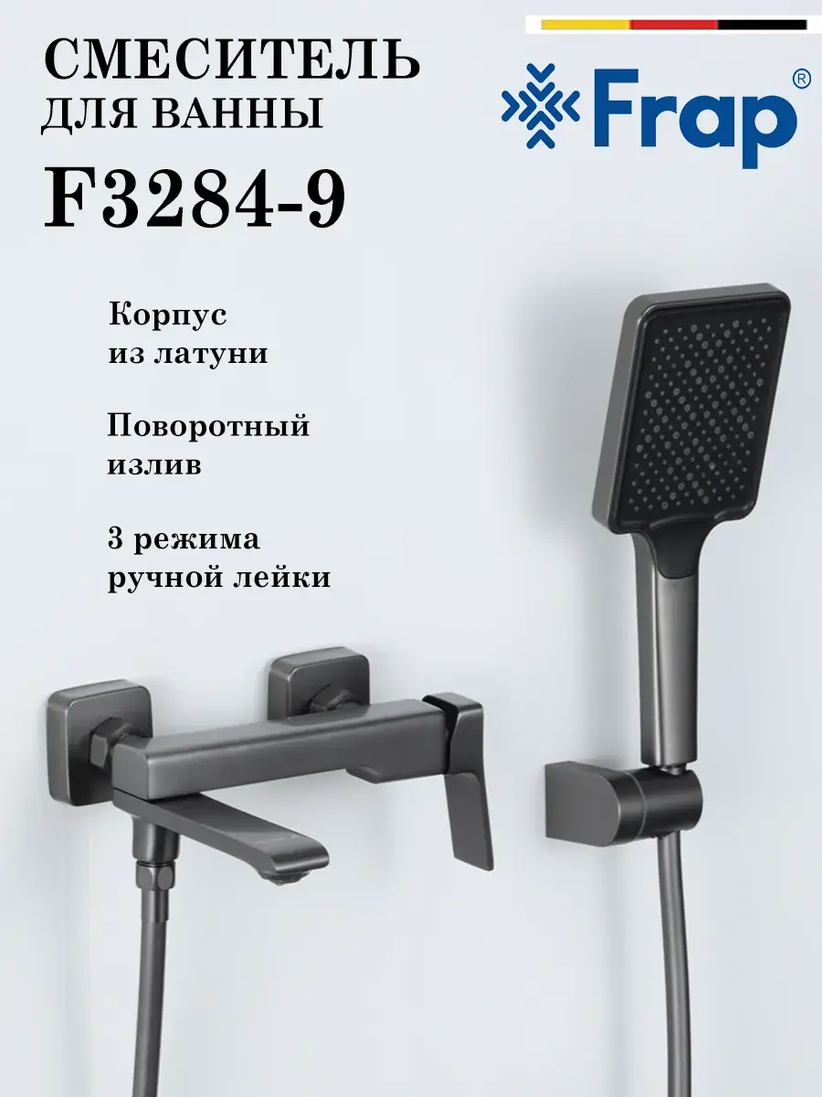 Смеситель для ванны с душем F3284-9 бренда Frap относится к продукции класса «люкс». Изготовлен из высококачественной латуни, что гарантирует его долговечность и надёжность, а также оснащён аэратором, который обеспечивает равномерный поток. Корпус оснащен испанским картриджем Sedal, который плавно открывает воду. Переключение с излива на ручную лейку производится его поворотом. Душевая лейка имеет 3 режима, которые меняются при помощи нажатия кнопки. Кран для ванны с коротким изливом станет стильной изюминкой Вашей ванной комнаты. Производитель даёт гарантию 3 года на корпус смесителя и 1 год на покрытие «графитовый».