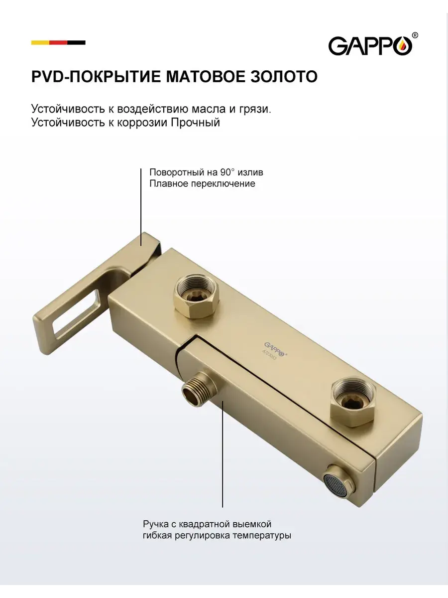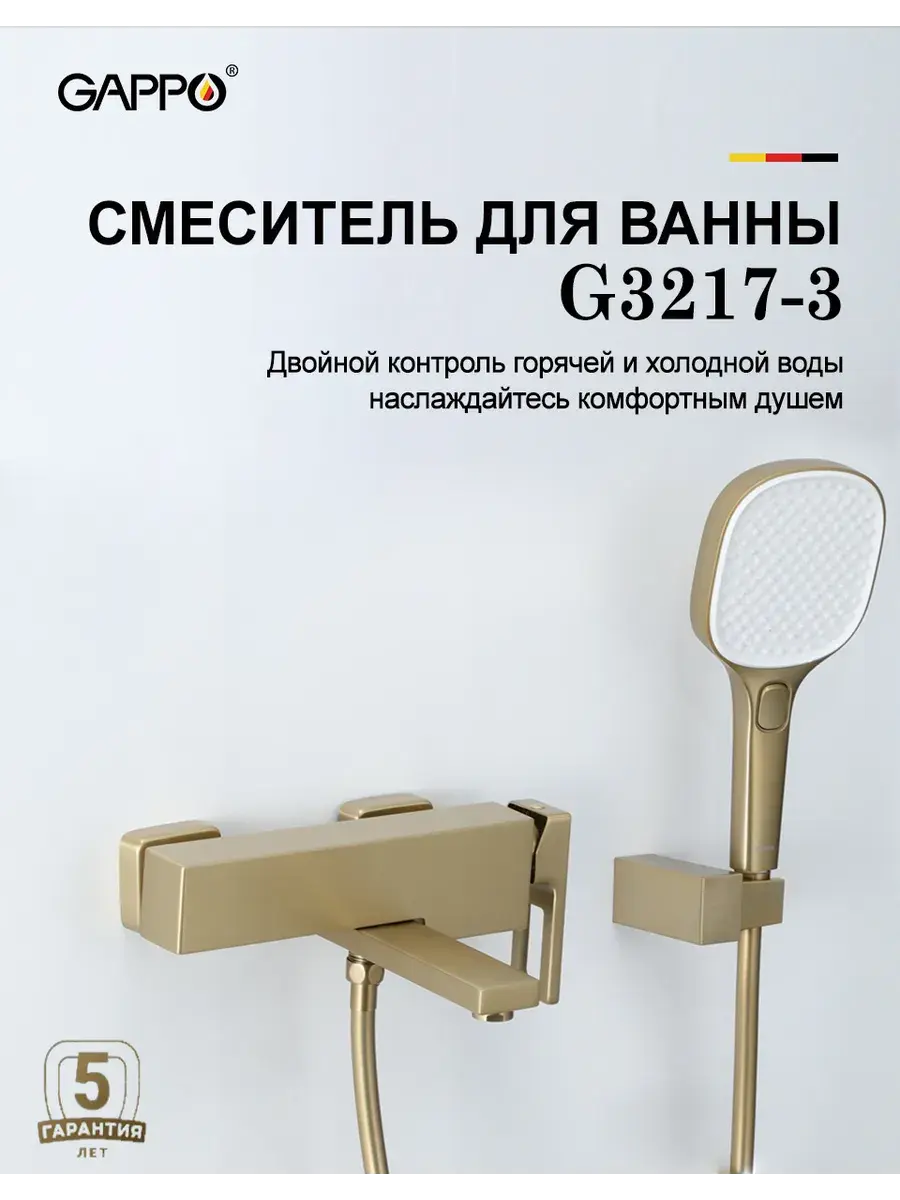 Смеситель для ванны с душем G3217-3 бренда Gappo относится к продукции класса «люкс». Изготовлен из высококачественной латуни, что гарантирует его долговечность и надёжность, а также оснащён аэратором, который обеспечивает равномерный поток. Корпус оснащен испанским картриджем Sedal, который плавно открывает воду. Переключение с излива на ручную лейку производится его поворотом. Душевая лейка имеет 3 режима, которые меняются при помощи нажатия кнопки. Кран для ванны с коротким изливом станет стильной изюминкой Вашей ванной комнаты. Производитель даёт гарантию 5 лет на корпус смесителя и 2 года на покрытие «сатиновое золото».
