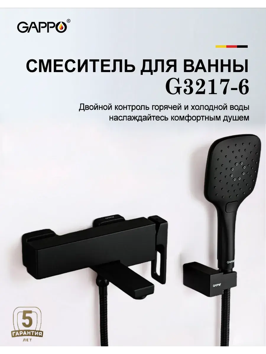 Смеситель для ванны с душем G3217-6 бренда Gappo относится к продукции класса «люкс». Изготовлен из высококачественной латуни, что гарантирует его долговечность и надёжность, а также оснащён аэратором, который обеспечивает равномерный поток. Корпус оснащен испанским картриджем Sedal, который плавно открывает воду. Переключение с излива на ручную лейку производится его поворотом. Душевая лейка имеет 3 режима, которые меняются при помощи нажатия кнопки. Кран для ванны с коротким изливом станет стильной изюминкой Вашей ванной комнаты. Производитель даёт гарантию 5 лет на корпус смесителя и 2 года на покрытие «черный матовый».